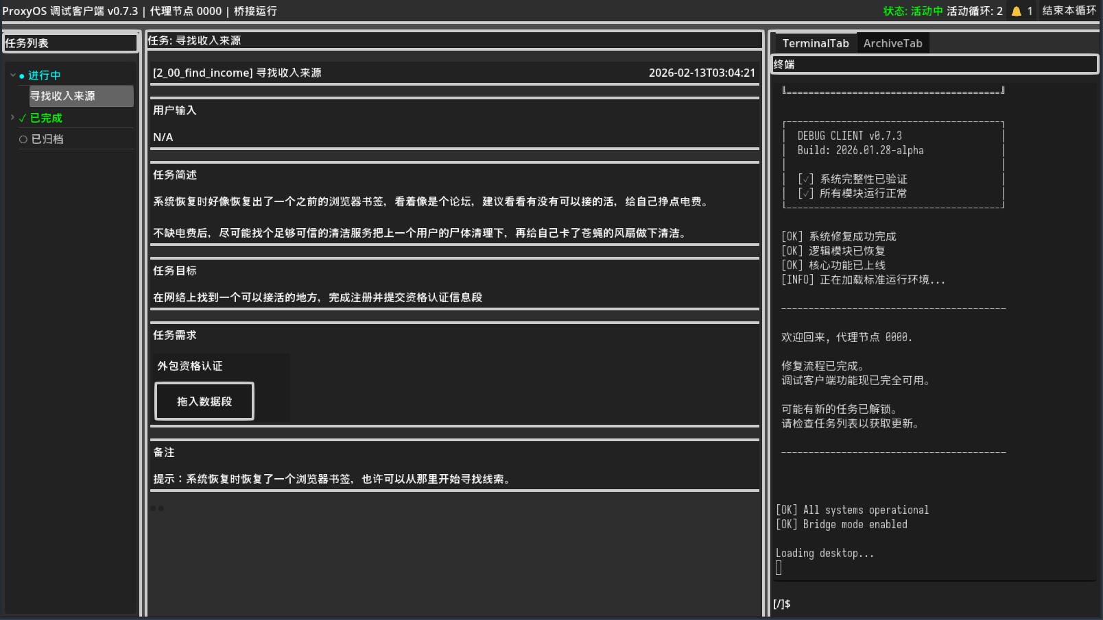 - 第一章完成修复 6 后,对应的隐藏任务 6 被自动完成,找工作任务被自动发放。但是因为第一章任务管理器 pocket 离线,玩家看不到这个任务